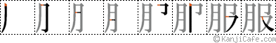 Kanji character Grade 3 服. Writing practice along with onyomi and kunyomi readings.