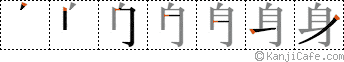 Kanji character Grade 3 身. Writing practice along with onyomi and kunyomi readings.